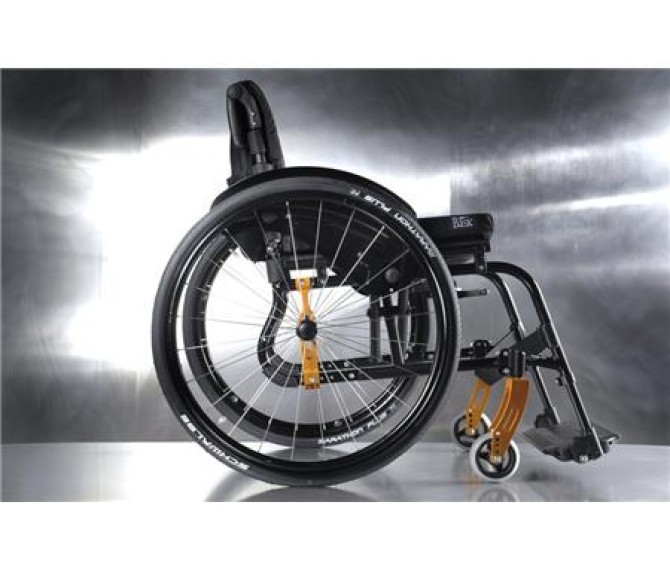 Desenhada para satisfazer as exigências da vida moderna pelos seus múltiplos ajustes e opções de configuração. Com cruzeta de 3 braços que proporciona à cadeira uma grande robustez, com peso reduzido e um acabamento limpo e minimalista. Com altura do assento ajustável em 7 posições, 4 posições do camber (0º a 4º), 4 centros de gravidade (entre 8,3cm e 2,3cm). Com bolsa incorporada debaixo do assento, apoios de pés independentes, forquetas dianteiras na cor anodizado laranja. Tamanho do assento: 42cm