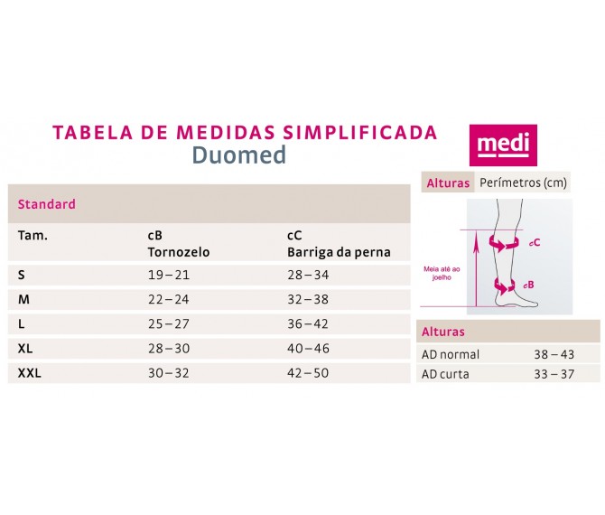 Consulte o catálogo para informação adicional, instruções de medição e tabela de medidas. O tamanho das meias elásticas não é escolhido a olho nem pelo tamanho do sapato. A perna deve ser corretamente medida e essa medição irá corresponder a um tamanho específico da tabela.