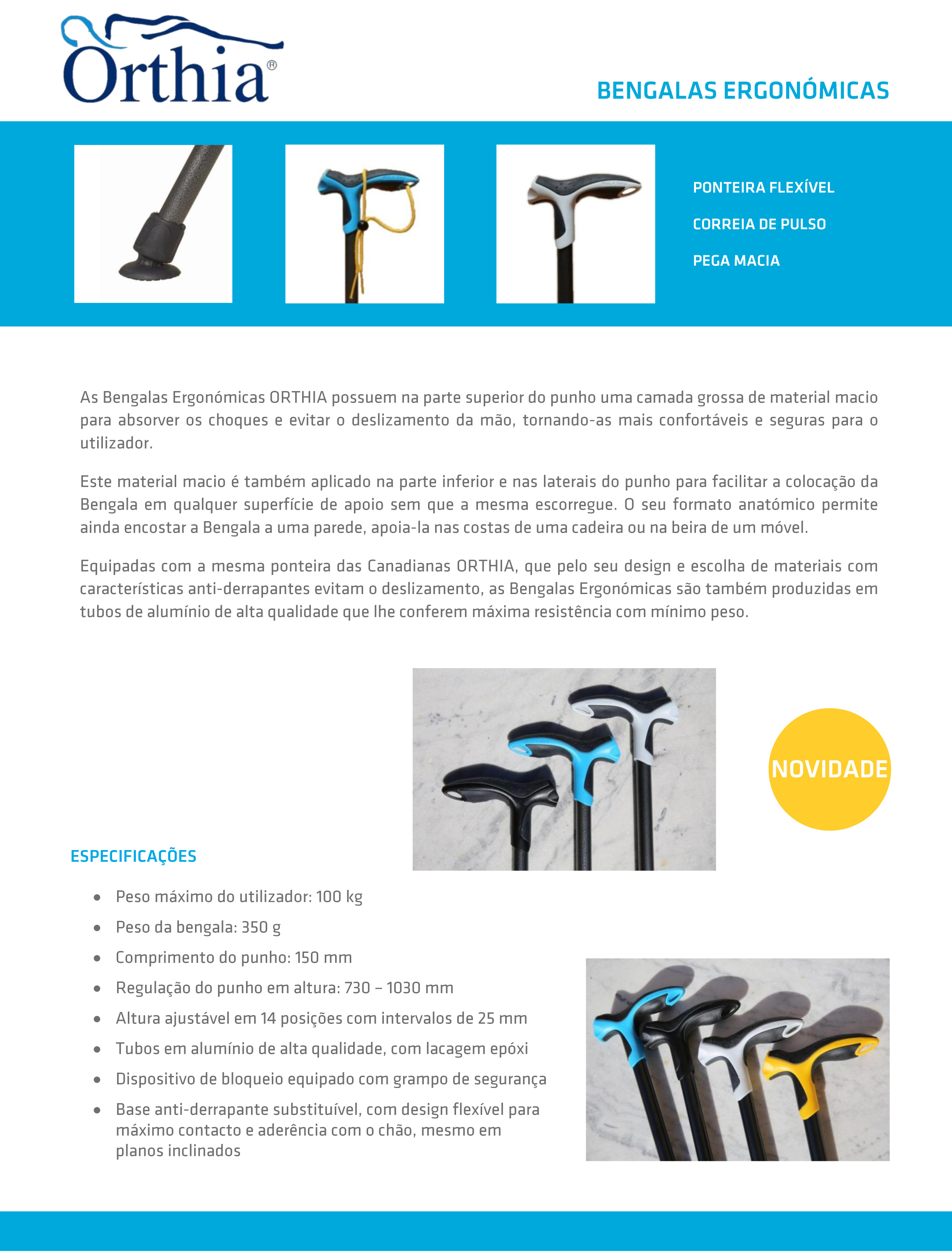 As bengalas ergonómicas Orthia possuem na parte superior do punho uma camada grossa de material macio para absorver os choques e evitar o deslizamento da mão, tornando-as mais confortáveis e seguras para o utilizador. Equipada com ponteiras antiderrapantes que evitam o deslizamento. Fabricadas em tubo de alumínio de alta qualidade que lhe conferem máxima resistência com mínimo peso.