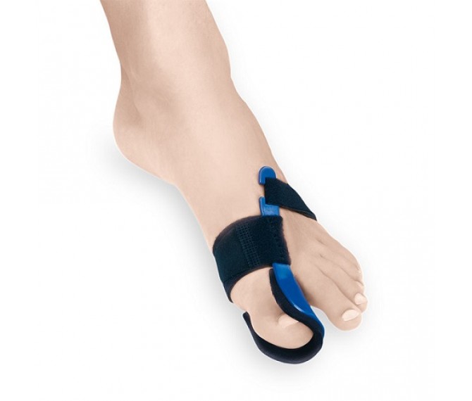 Em termoplástico e tecido aveludado com fecho micro gancho, uma almofada na zona do primeiro dedo que em conjunto com uma correia de compressão à altura do joanete, mantém os primeiros metatarsos alinhados na posição correcta durante a noite, reduzindo a dor desconfortável e impedindo a sua evolução.