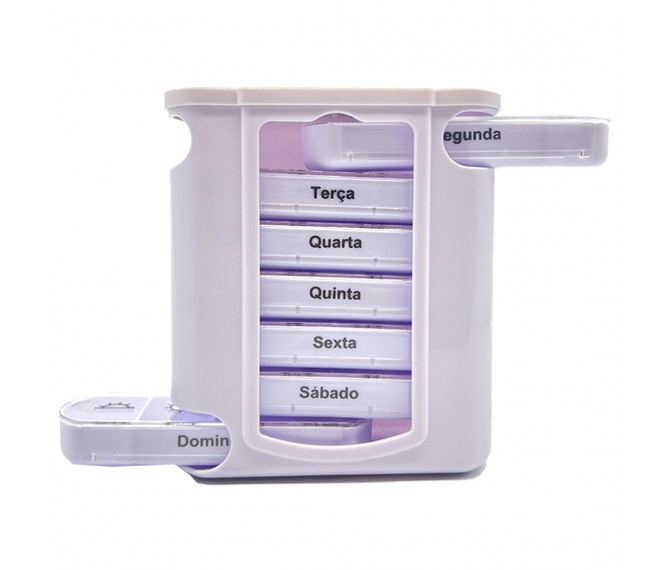 Caixa de comprimidos em formato de torre programada para 7 dias com módulos destacáveis. Cada módulo contém 4 compartimentos (manhã, meio-dia, tarde e noite).