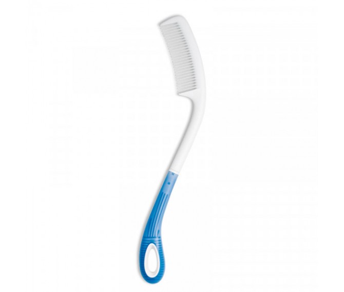 Pente de cabo longo, ergonomicamente curvado para se adaptar à forma da cabeça, que permite pentear o cabelo com o mínimo de esforço, segurando-o junto ao corpo.