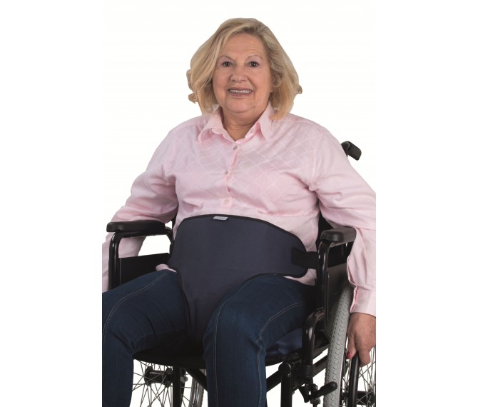 Cinto pélvico acolchoado Orthia®. Cinto estabilizador da pélvis com 3 pontos de fixação e ajuste. A fixação confortável do paciente à cadeira de rodas permite manter a pélvis junto ao encosto, prevenindo assim deslocações e deslizamentos.