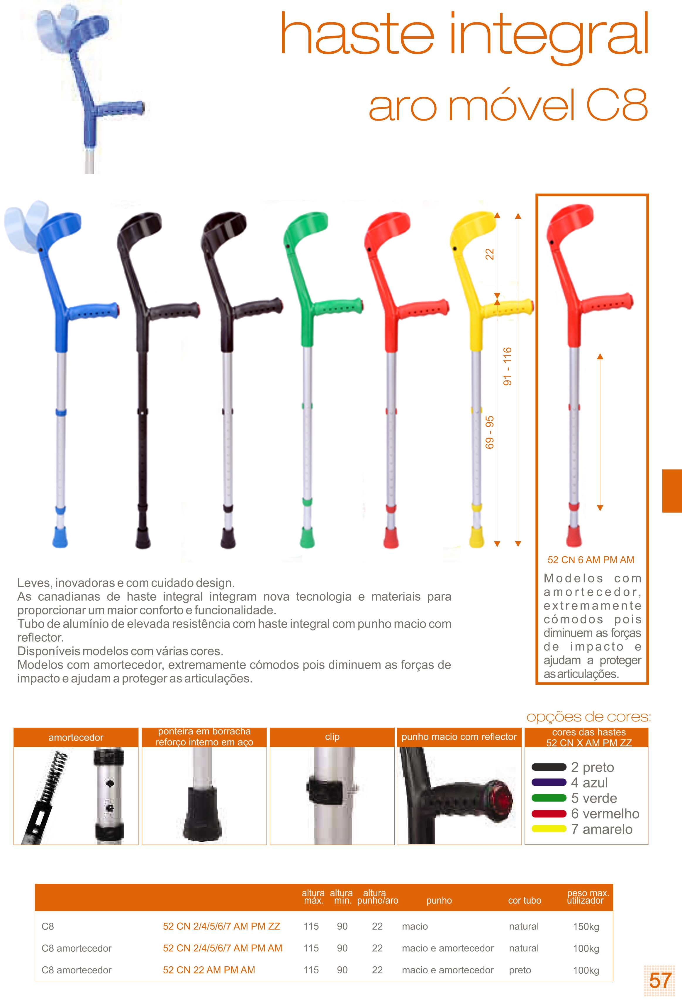 Leves, inovadoras e com um design cuidado. As canadianas de haste integral articulada integram nova tecnologia e materiais para proporcionar um maior conforto e funcionalidade. Tubo de alumínio de elevada resistência com haste integral com punho macio com refletor. Disponíveis modelos com várias cores. Peso máximo do utilizador: 100Kg.