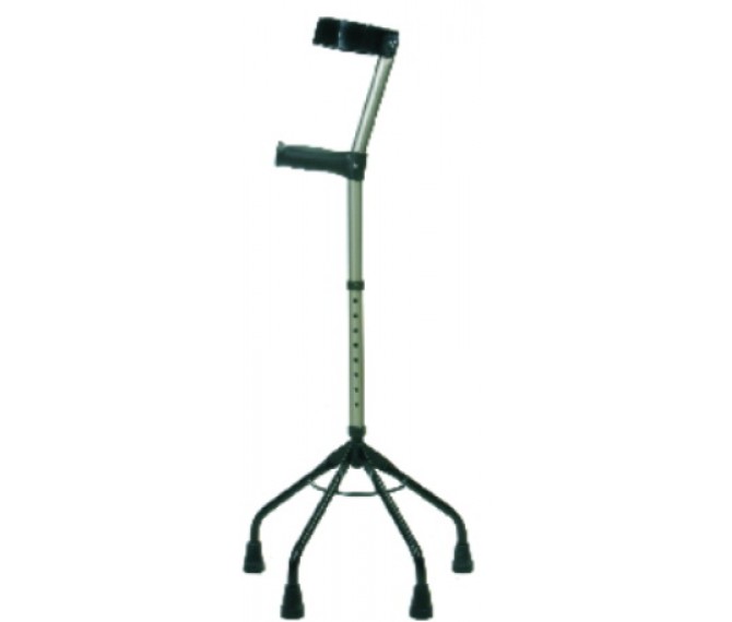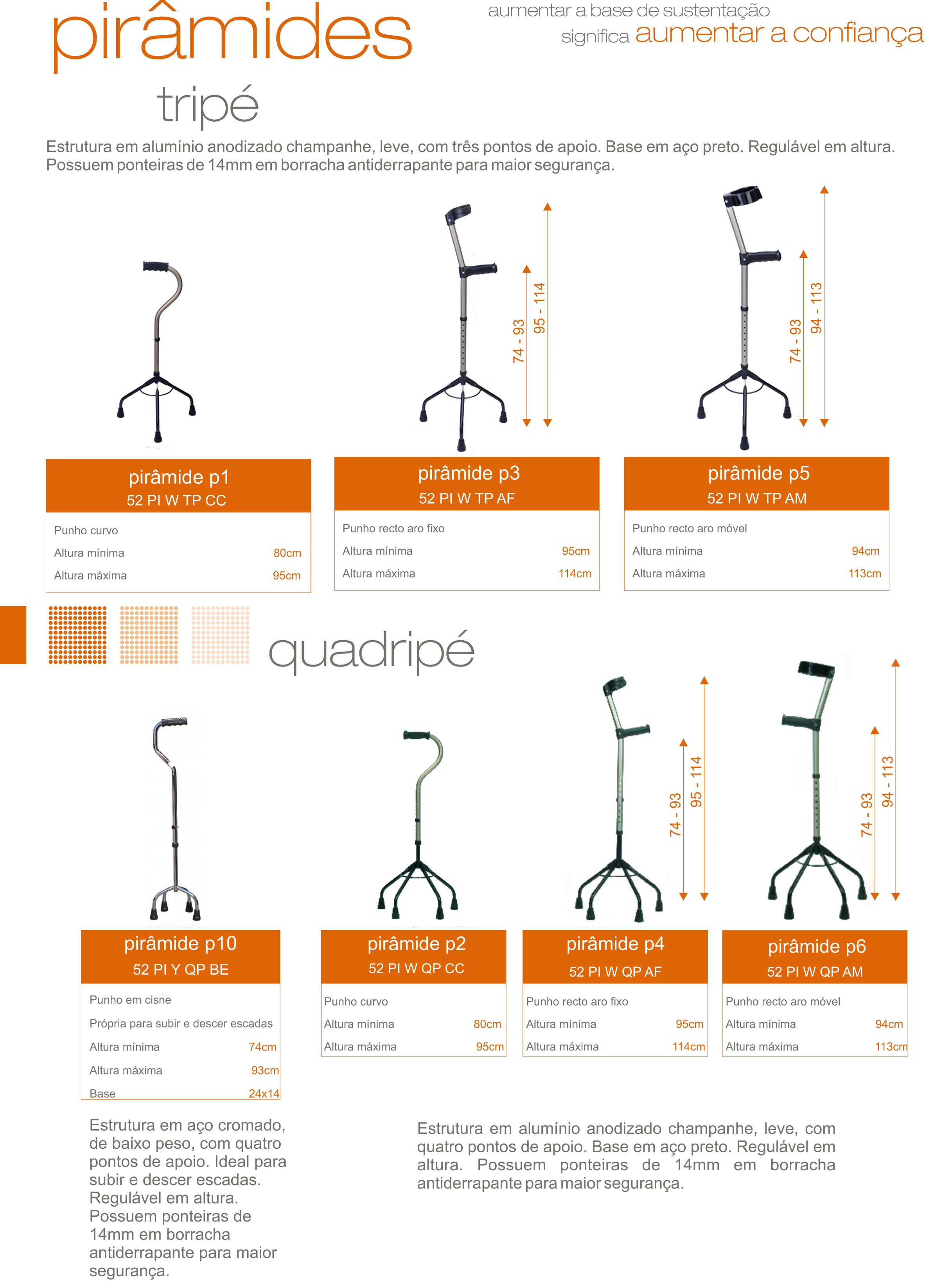 Estrutura em alumínio anodizado champanhe, leve, com quatro pontos de apoio. Base larga em aço preto. Regulável em altura, com apoio do antebraço e aro móvel. Possuem ponteiras de 14mm em borracha antiderrapante para maior segurança. Altura de 74 a 93cm.