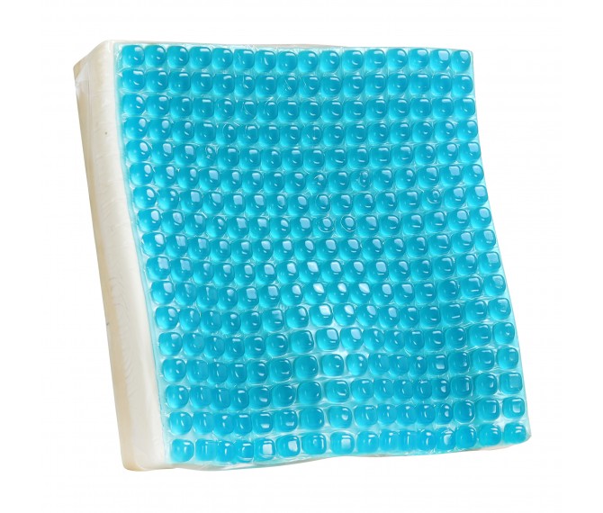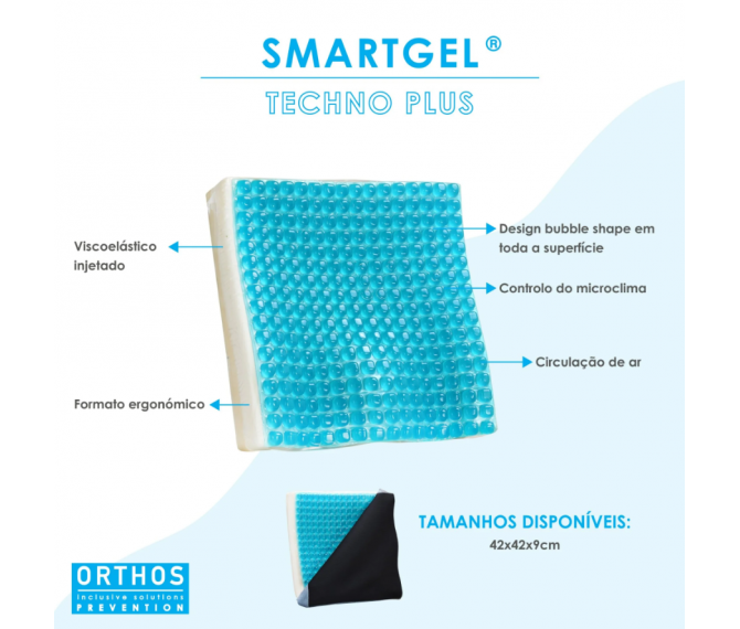 Constituída por viscoelástico injetado de alta densidade D85/m3 e topo em Smartgel®. O viscoelástico é extremamente moldável e aconchegante, garantindo uma adequada distribuição da pressão, bem como a redução da pressão exercida sobre a pele e vasos sanguíneos. O Smartgel® modifica a sua forma tridimensionalmente, auxiliando na distribuição da pressão corporal, na circulação sanguínea e no controlo do microclima (temperatura e humidade). O design bubble shape, fornece uma sensação de conforto única e promove a circulação de ar. O formato ergonómico promove uma adequada postura. Capa bielástica impermeável e respirável, com topo em tecido 3D respirável preto e lateral em tecido azul/cinza. Com pega para transporte.