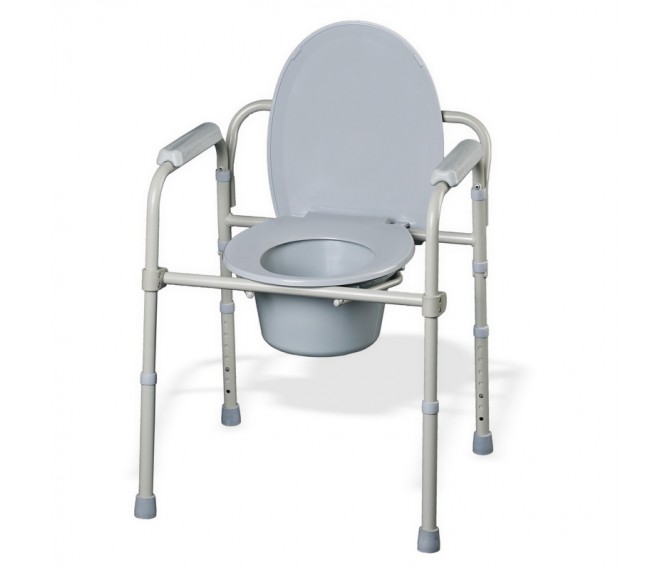 Cadeira dobrável e prática que serve tanto como uma cadeira sanitária no quarto (incorpora um balde com tampa e alça) quanto como um elevador de sanita com braços diretamente sobre a sanita. Portátil e ajustável em altura. Desmonta-se sem necessidade de ferramentas.