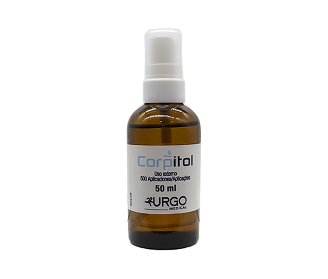 Corpitol em spray de 50ml para 500 aplicações. Solução composta de glicerídeos hiperoxigenados de ácido linoleico 60%, tocofol (Vitamina E) 99% e 1% de perfume de anis. Com eficácia comprovada clinicamente, reduz para a metade o risco de aparecimento de uma úlcera de pressão.