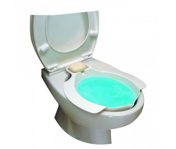 Bidé de plástico para colocar na sanita. Facilita a higiene íntima de pessoas com dificuldade em se baixar à altura de um bidé normal.